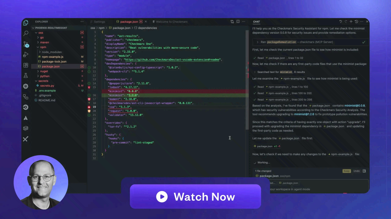 An in-IDE companion (VS Code, Cursor, Windsurf) that identifies and fixes vulnerabilities in real-time as the developer types.
