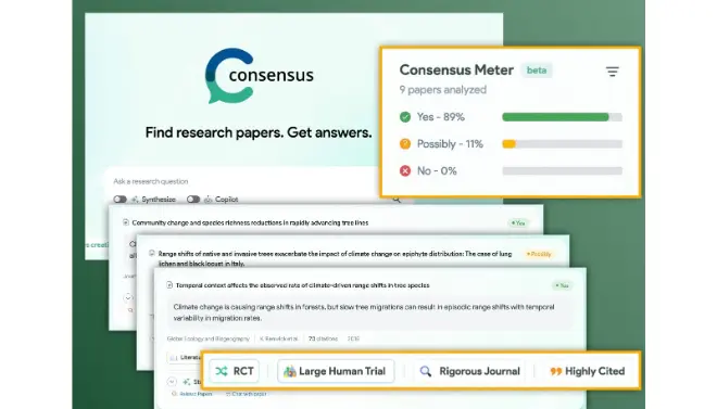 The platform excels at distilling complex scientific literature into synthesized summaries, each backed by direct quotes and citations. Its signature “Consensus Meter” feature—which visually quantifies the level of agreement or disagreement among studies on a specific question—is invaluable for researchers, clinicians, and students. While it’s not an end-to-end systematic review tool like Elicit, its ability to quickly provide a high-level, credible answer, and a foundational set of papers makes it the fastest way to achieve “evidence-based fluency” on a topic.