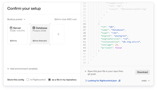 Flightcontrol generates the flightcontrol.json file and initiates the first build on AWS.