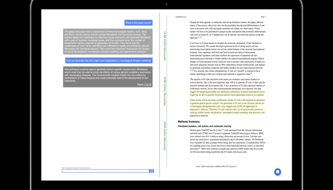 Generates quick, structured summaries (e.g., 5 key bullet points) of entire papers and can extract specific data (names, dates, financial figures) into tables.