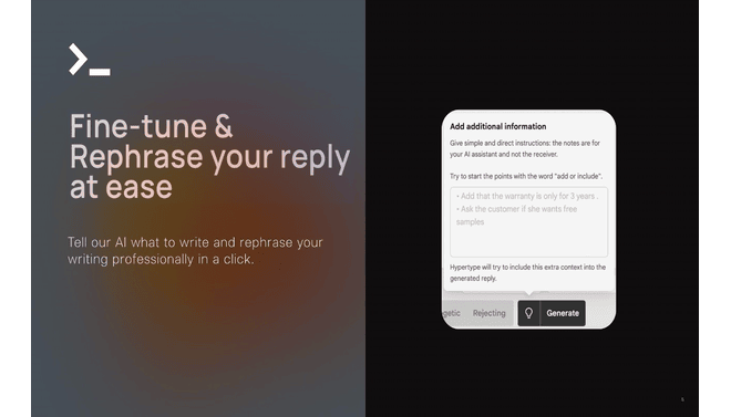 By leveraging this proprietary company knowledge, Hypertype ensures responses are not only fast but also unique, on-brand, and accurate, eliminating the reliance on static templates or time-consuming manual searches for information.