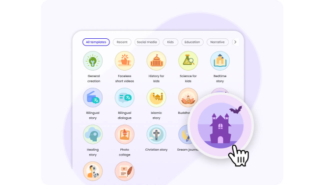 Choose from hundreds of smart templates and visual styles, or select a personalized AI avatar to lead your narrative.