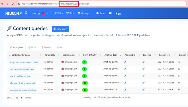 The user inputs their target keyword (Content Query). NeuronWriter executes the SERP analysis and creates a new document.