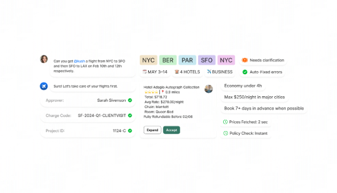 Book flights, hotels, and car rentals by simply describing your needs in natural language via Slack or Microsoft Teams.