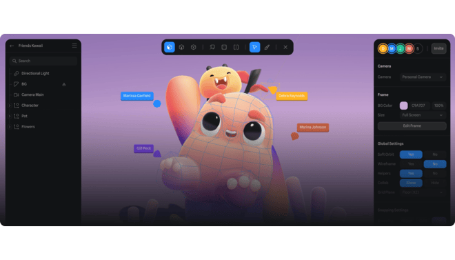 Allows multiple team members to work together on the same 3D scene simultaneously, with roles and permissions.