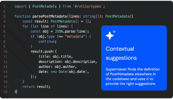 As you type, Supermaven will offer gray “ghost text” suggestions. Simply press Tab to accept entire blocks of code.