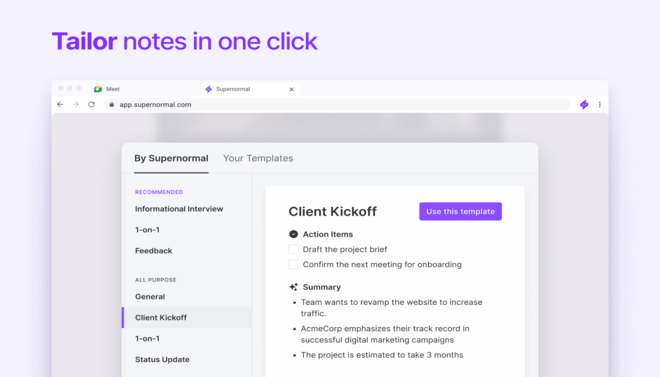 Supernormal is known for its fast, non-intrusive automation of meeting follow-up workflows. Its primary strength lies in its ability to generate clear, actionable notes and summaries instantly and integrate them directly into tools like Slack and Asana. The platform’s commitment to providing a bot-free option (via a Chrome extension) is a unique selling point for internal team privacy.