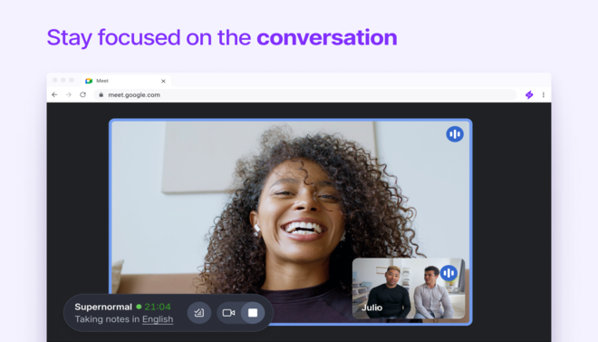 Participants focus entirely on the discussion while Supernormal captures the audio, identifies speakers, and transcribes the conversation in real-time.