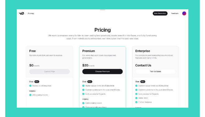 Vercel v0 operates on a credit-based model. Credits are consumed for each generation or complex prompt iteration.